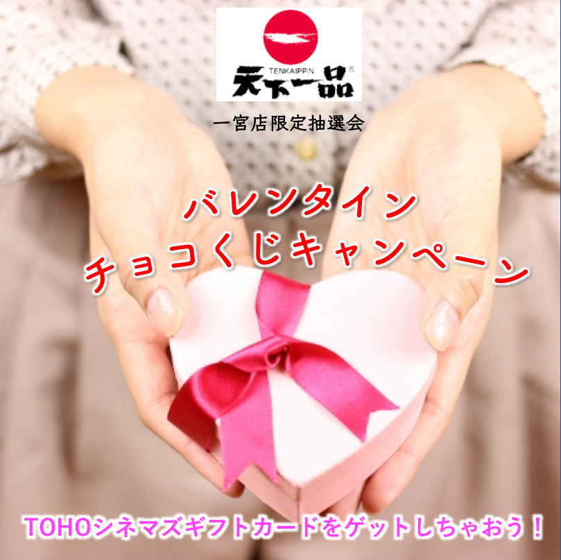 天下一品一宮店では「チョコくじを引いてTOHOシネマズギフトカードをゲットしちゃおう‼️」キャンペーン実施中です😊 店頭でチョコに付いている抽選券をゲットして 天下一品のマークが出たらギフトカード3,000円分が当たり〜♪ 当たりは3名様、その他は50円の割引券です🤗 期間は14日迄ですよ! ただし、LINE@友達限定なのでプロフURLから登録をお忘れなく! カップルで仲良くアッツアツのこってり🍜食べて、そのあとはラブラブ映画観に行って下さいね❣️